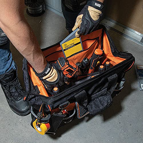 Klein Tools 55469 Tradesman Pro Wide-Open Tool Bag Made of 1680 Ballistic Weave with Molded Bottom and Detachable Shoulder Strap, Black/Orange, One Size