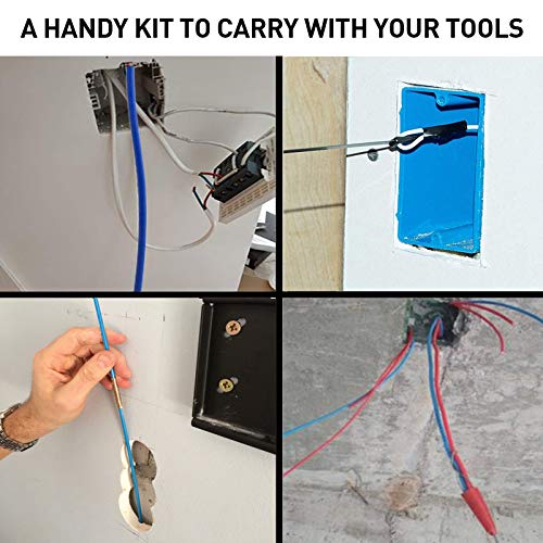 • 50' Fiberglass Cable Wire Running Rod Coaxial Electrical Connectable Fish Tape Pull Kit With Hook And Hole Kit In Transparent Tube, Blue