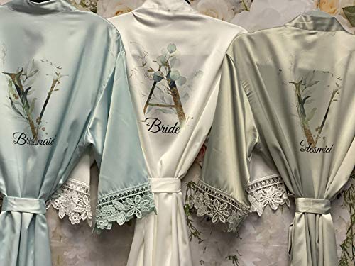 • Personalized Bridesmaid Robes Lace Bridal Robe Customized Gift Floral Design Satin Kimono Robe Wedding Party Getting Ready Short Robe Bachelorette Party