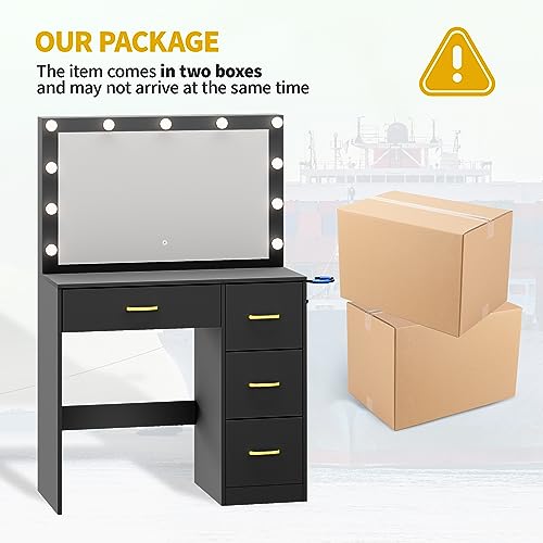 • DWVO Makeup Vanity Table, Vanity Desk Set with Large Mirror, LED Lights with Adjustable Brightness, Bedroom Vanity Table with 4 Drawers and Cushioned Stool for Women Girls, Carbon Black