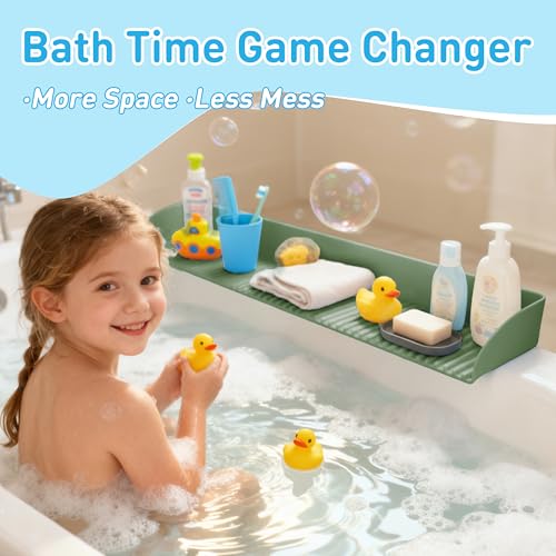 • Roslim Bathtub Splash Guard for Tub - Silicone Bath Ledge for Toddlers, Tub Play Shelf for Kids with Suction Cups, Bathtub Side Tray for Bath Toys, Bathroom Accessories for Toddlers, Olive Green